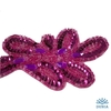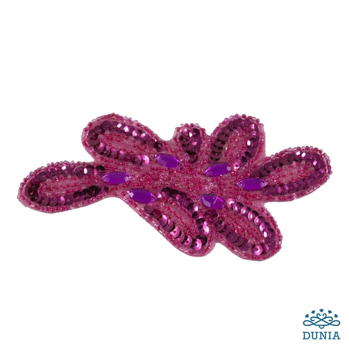 Aplique termoadhesivo de fantasía de lentejuelas, bolitas de abalorio y pedrería en color fucsia. Las dimensiones de la aplicación son 14 cm de ancho y 7 cm de largo.