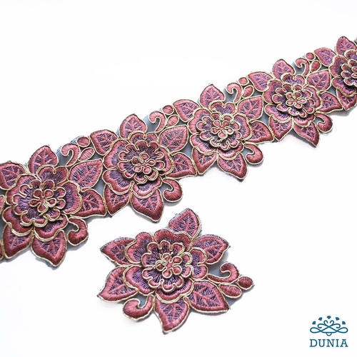 Pasamanería bordada con flores de hilo sedoso y bordeadas en dorado. Su ancho es de 9 cm. Se pueden cortar para utilizarlas como aplicaciones.