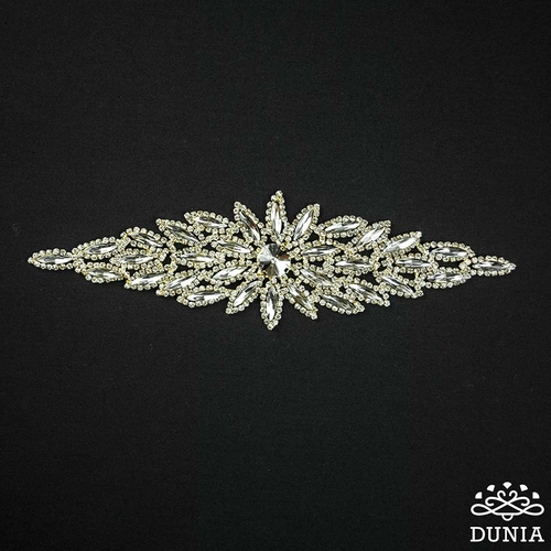 Aplicación dorada de cristales de Swarovski. Su tamaño es 19 x 6 cm.