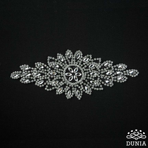 Aplicación termoadhesiva plata de cristales Swarovski y strass. Su tamaño es 19 x 7 cm.