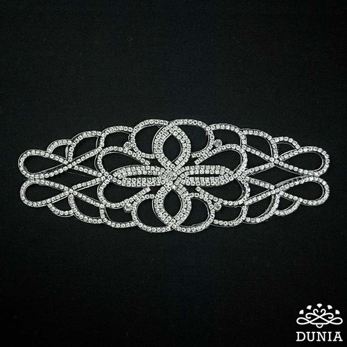 Aplicación plata de cristales de Swarovski. Su tamaño es 21 x 8 cm.
