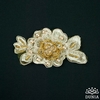 Flor bordada en hilo de seda dorado con perlas, abalorio y cuentas de cristal de roca doradas. Mide 11 x 6 cm.