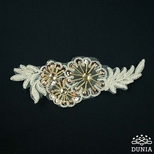 Aplicación bordada en organdí con hilo de seda beige con abalorio, lentejuelas y cristales strass dorados. Mide 19 x 7 cm.