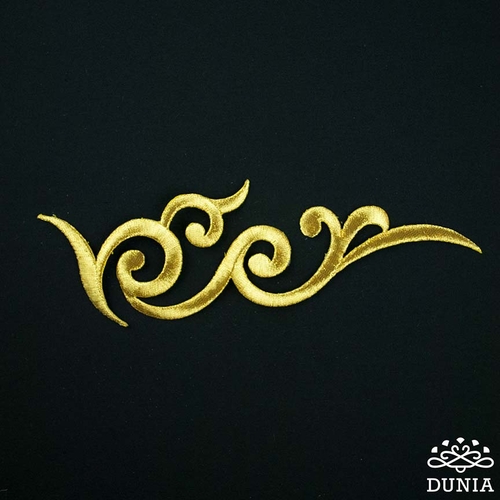 Aplicación termoadhesiva bordada en hilo dorado. Mide 19 x 5,5 cm.