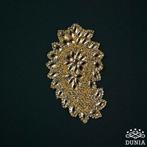 Aplicación termoadhesiva dorada de cristales strass. Su tamaño es 10 x 6 cm.