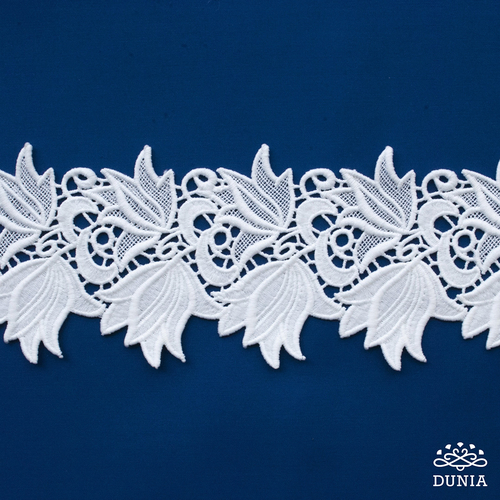 Encaje de doble punta de guipur grueso en color blanco. Ancho de 9 cm.