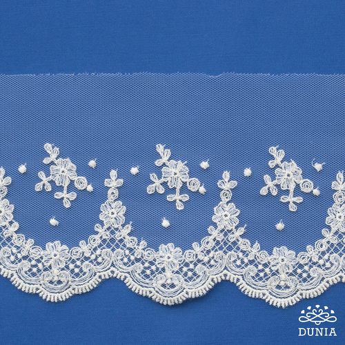 Punta mediana de encaje de tul bordado en hueso. Ancho 9 cm.
