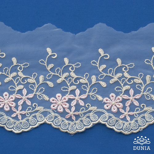 Punta ancha de tul bordado en beige y rosa. Mide 9 cm de ancho.