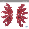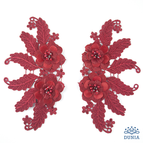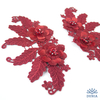 Aplicación bordada en color rojocon flores en dos tejidos y pistilos de cristal y perlitas. Mide 19 x 10 cm.