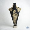 Aplicación bordada en hilo dorado y perlas doradas sobre organdí negro. Mide 16 x 10 cm.