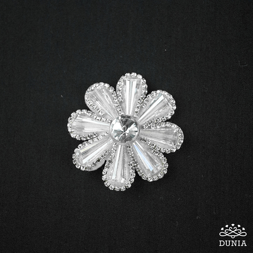 Aplicación de critales en forma de conos haciendo pétalos de una flor y cristales de Swarovski alrededor. Mide 5 cm.
