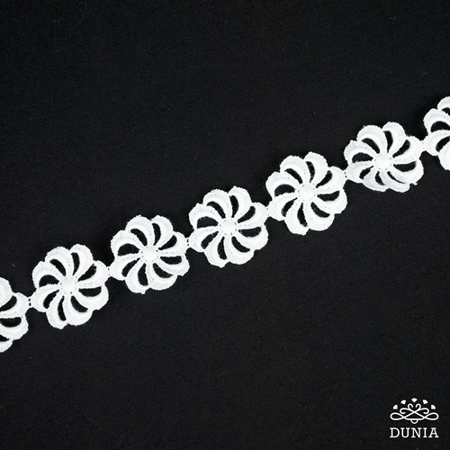 Encaje de guipúr bordado en hilo blanco de algodón mate. Mide 2,5 cm de ancho.