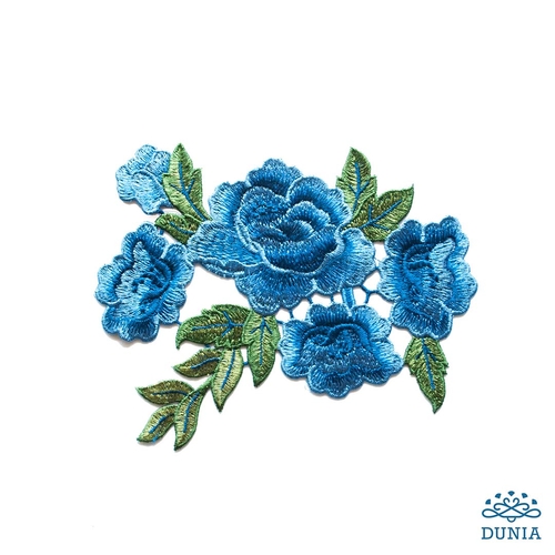 Aplicación bordada de flores en distintas tonalidades de azul y hojas verdes. Sus dimensiones son 18 x 15 cm.