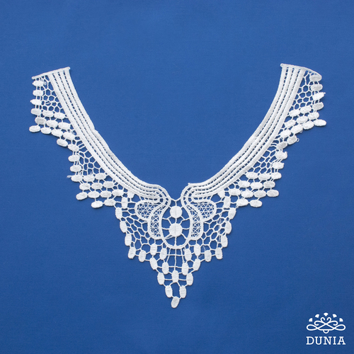 Aplicación bordada de guirpur en hilo blanco sedoso. Mide 26 cm de largo, 25 cm de ancho, 16 cm en el interior del cuello de lado a lado.
