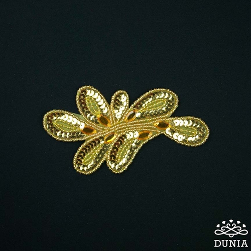 Aplicación termoadhesiva de lentejuelas, cristales strass y abalorio dorado. Mide 13 x 7 cm.