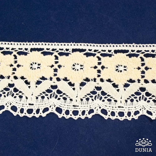 Original encaje de bolillo con flores de chenilla en tono amarillo claro y hojas verde agua. Hace juego con el fleco con referencia 00163. Su anchura es de 7 cm.