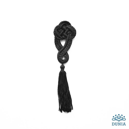 Borla artesanal con escarapela. Está hecha de pasamanería y cordón trenzado. Sus dimensiones son 18 × 5 cm.