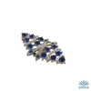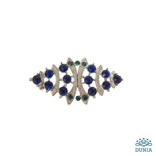 Broche de fantasía con cierre de enganche. El broche está hecho en un metal plateado con incrustaciones de cristales azules. Las dimensiones del broche son 5 cm x 2,5 cm.