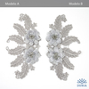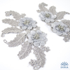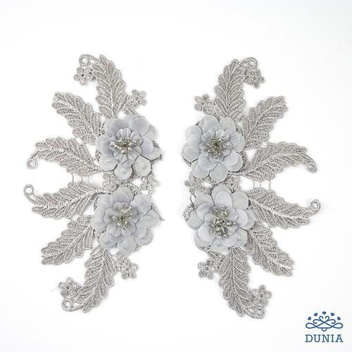 Aplicación bordada en color gris con flores en dos tejidos y pistilos de cristal y perlitas. Mide 19 x 10 cm.